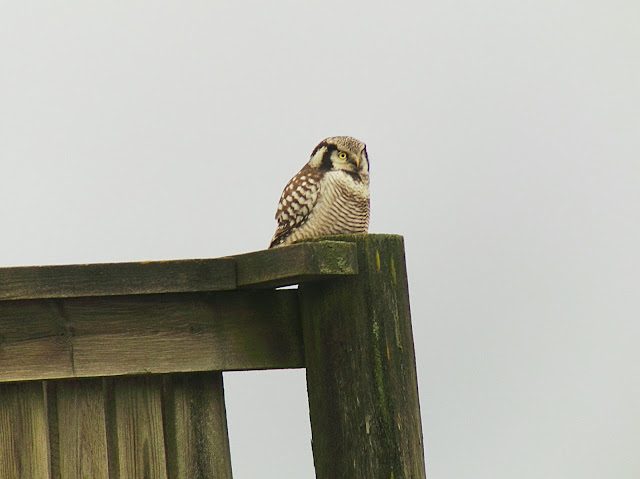 As we rounded a corner and saw the tower, we both saw a raptorish shape sitting on the tower itself. Expecting a Sparrowhawk or Gos, we were pleasantly surprised to see a stunning Hawk Owl. A new bird, and a stunning one too!